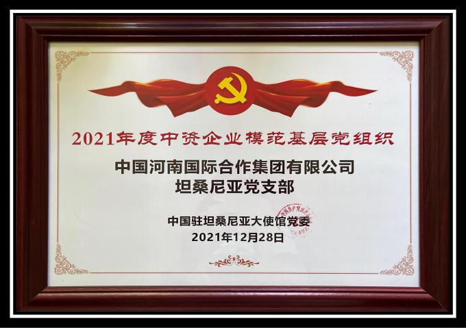 2021年12月28日,集团坦桑尼亚党支部被中国驻坦桑尼亚大使馆党委授予“2021年度中资企业模范基层党组织”荣誉称号。